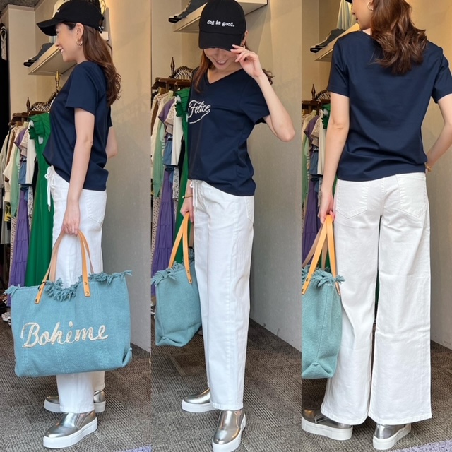 Tシャツ¥10890 パンツ¥15180 日本製で肌触りも着心地も抜群なビジュー付きTシャツにホワイトデニム✨ デニムはウエストゴムで、こちらも最高の履き心地です💛 Tシャツ¥10890 パンツ¥15180 バッグ¥9900 2022年6月11日
