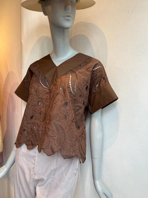 レースのトップス💕 濃いめのブラウンが夏におしゃれなレーストップスが到着しました💕 ハイクオリティなコットン100%なので、ホームクリーニングで、いつも綺麗に着て頂けます⭐️⭐️⭐️ 白パンや、ベージュ、ブラックなどのボトムスに合わせても、ラフなデニムに合わせても素敵です 🎉 大人のサマートップスをぜひ一枚いかがでしょうか? 2022年6月11日