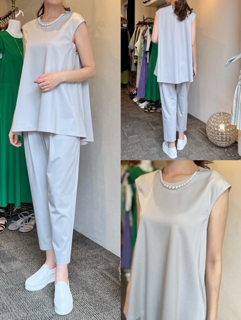 トップス¥13200 パンツ¥14190 肌触りの良い柔らかなジャージー素材のセットアップ💛 トップスは首元にパールが施されており、アクセサリーいらずです✨ パンプスを合わせればオケージョンに、スニーカーを合わせればカジュアルに変身できますよ😊 トップス¥13200 パンツ¥14190 2022年6月12日