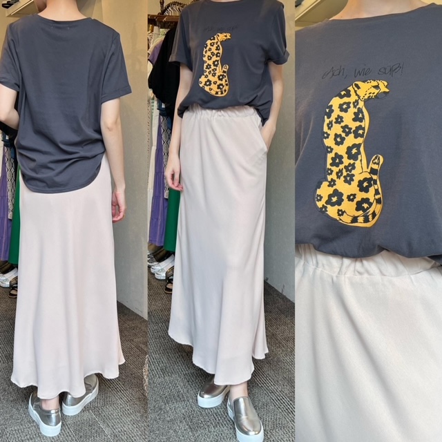 Tシャツ¥8800 スカート¥13200 チーターデザインTシャツ✨ デザイナーの手書きチーターは、よーく見ると花柄の模様になっています☺️ さらさらで肌触りの良いスカートは、トップスしだいで様々な着こなしが出来てとてもおすすめです💕 Tシャツ¥8800 スカート¥13200 2022年6月12日