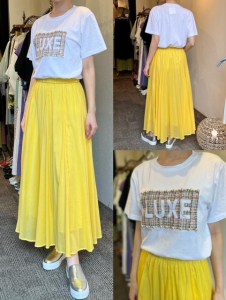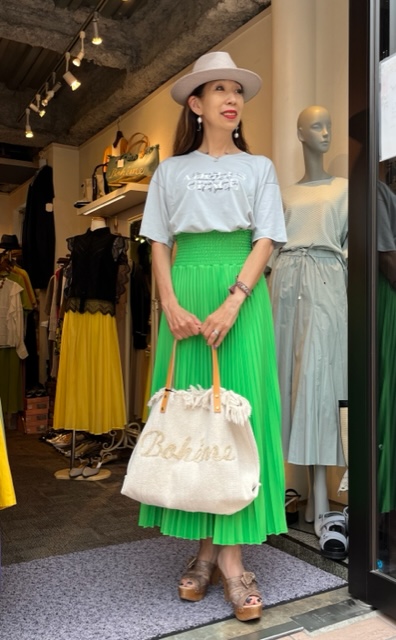 ビビッドなアップルグリーンのプリーツスカート には、爽やかなペールブルーのテイシャツを合わせて、初夏の街に映えるスタイルはいかがでしょうか? サラッサラーのプリーツスカートは、とっても履きやすくて、足捌きが良いです💕