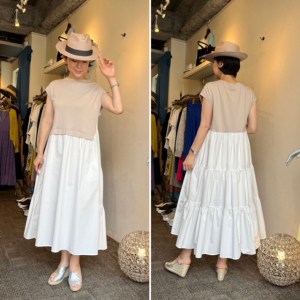 ベージュ✖️ホワイトのワンピース💕 カットソー生地に透けにくい白のコットンティアードスカートをドッキングしたワンピースが到着しました💕 ストンと一枚で着られて、めちゃ涼しい💕💕💕 生地の良さで高級感あり⭐️⭐️⭐️ 甘すぎない大人な雰囲気もGOOD😍 ワンピース ¥13800+tax💕 本革サンダル ¥15000+tax 本パナマ帽 ¥14500+tax💕 2022年6月21日
