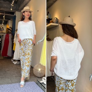 白ニット✖️ガラパン💕 ハワイアンなテイストがお洒落な柄パンに合わせて女らしいサマーニットを合わせたコーデはいかがでしょうか? 大雨が降っても、真夏の日差し除けにもお役立ちの七分袖がGOOD⭐️😊 ニットはお色違いで、ブルーグリーンもございます ニット ¥12000+TAX パンツ ¥12800+TAX 帽子 ¥3900+TAX 2022年6月21日