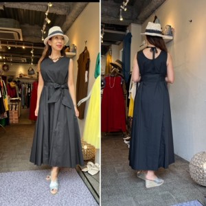 ブラックワンピース💕 夏も爽やかなコットンタイプライター素材のワンピース💕 女らしく見えるネックラインが素敵💕 ウェストのリボンは取り外し出来ますので、サラッとAラインのワンピースとして着てもGOOD⭐️⭐️⭐️ ワンピース ¥19000+TAX フリーサイズ 帽子 uv90%カット ¥4900+TAX サンダル ¥15000+TAX 2022年6月21日