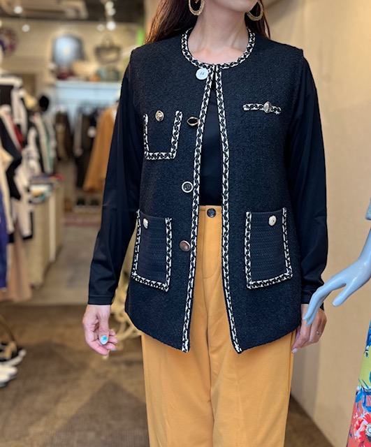 インナーに着ているフリルブラウス ¥3900+taxも、ホワイト、ブラック、マスタード、モスグリーンの4カラーで到着しております 完売必至ですのでお見逃しなく💕😃💕