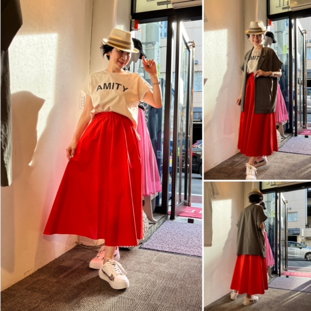 今年らしい朱赤のロングスカート は、ライトベージュのロゴTシャツ を合わせて、赤スカートのビビッドな感じをソフトなイメージに。 ジャケットは、今回クールなイメージのカーキを選んでみました。