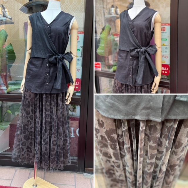 レオパードのチュールスカート💕 晩夏になりましたので、こんなお洒落なレオパードのチュールスカートはいかがでしょうか? 秋も冬もずっと大活躍してくれます まだまだ暑い今なら、リネンのノースリーブのトップスを合わせて😍 今ならプチプラですよぉ〜 サイドリボンブラウス ¥8900 SALE ¥6230+tax💕 スカート ¥13000+tax 2022年8月7日
