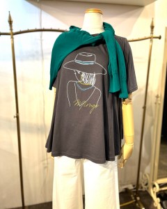 デザインTシャツ💕SALE 手書きの女の子デザインがポイントのAラインのトップス💕 チャコールグレーで晩夏も爽やかなにお洒落💕 ¥8900+tax SALE ¥6230+tax💕💕💕 カーディガン ¥4900+tax 2022年8月7日
