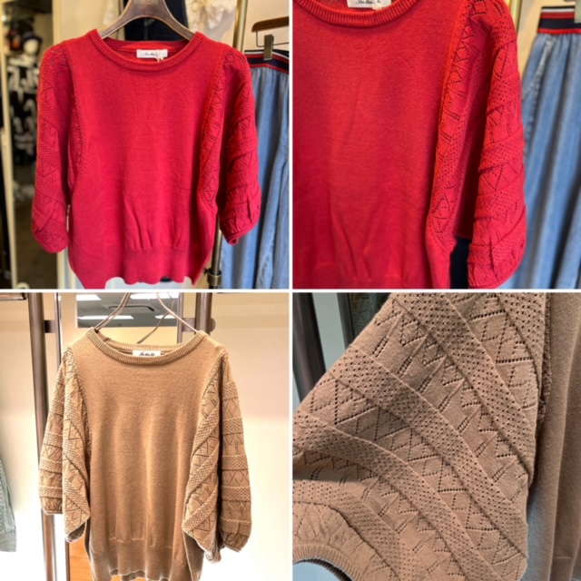 秋のニットトップス💕¥4900+tax お袖の透かし編みが素敵な秋のニットトップスが到着しました💕 コットン60 アクリル40のサラッとした肌触りで、初秋から着ていただけます こっくりとしたレッド、合わせやすいグレージュ、定番のブラックの3カラーです メーカー完売のアイテムですので、お早めにチェックされて下さいね💕 ホームクリーニングOK💕 2022年8月27日