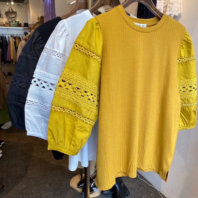 袖ボリュームトップス ¥4900+tax 見頃は伸縮のカットソーで、お袖は、ハシゴレースを組み合わせたおしゃれなデザインです💕 一枚で着ても、重ね着にも、とってもおしゃれなデザインです。 今すぐに着られますよぉ💕😃🙌 White、yellow、Blackの4カラーです 2022年8月25日