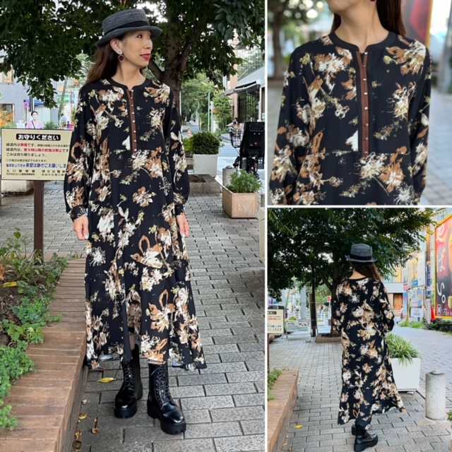 プリントワンピース💕¥15800+tax シックなフラワープリントのワンピースはいかがでしょうか? 前縦が配色になったおしゃれなデザインです ポリエステル素材で軽い着心地が嬉しい💕 ジレを合わせて旬の着こなしになりますよぉ〜 足元はレースアップブーツでスタイルアップ⭐️⭐️⭐️ ブーツ ¥6900+tax ワンピース エイミーロー ¥15800+tax 着丈120cm バスト 127cm ポリエステル100 2022年9月2日