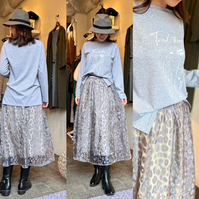 ロンT¥7040 スカート¥12100✨ グレーのワントーンコーデ💛 トップスのロンTは、デザイナー自ら書いたイラストだそうです😍 とっても素敵ですよ✨✨ スカートも華やかで、インナー次第でカジュアルにもフォーマルにも着ていただけるのでおすすめです☺️ ロンT¥7040 スカート¥12100 2022年9月14日