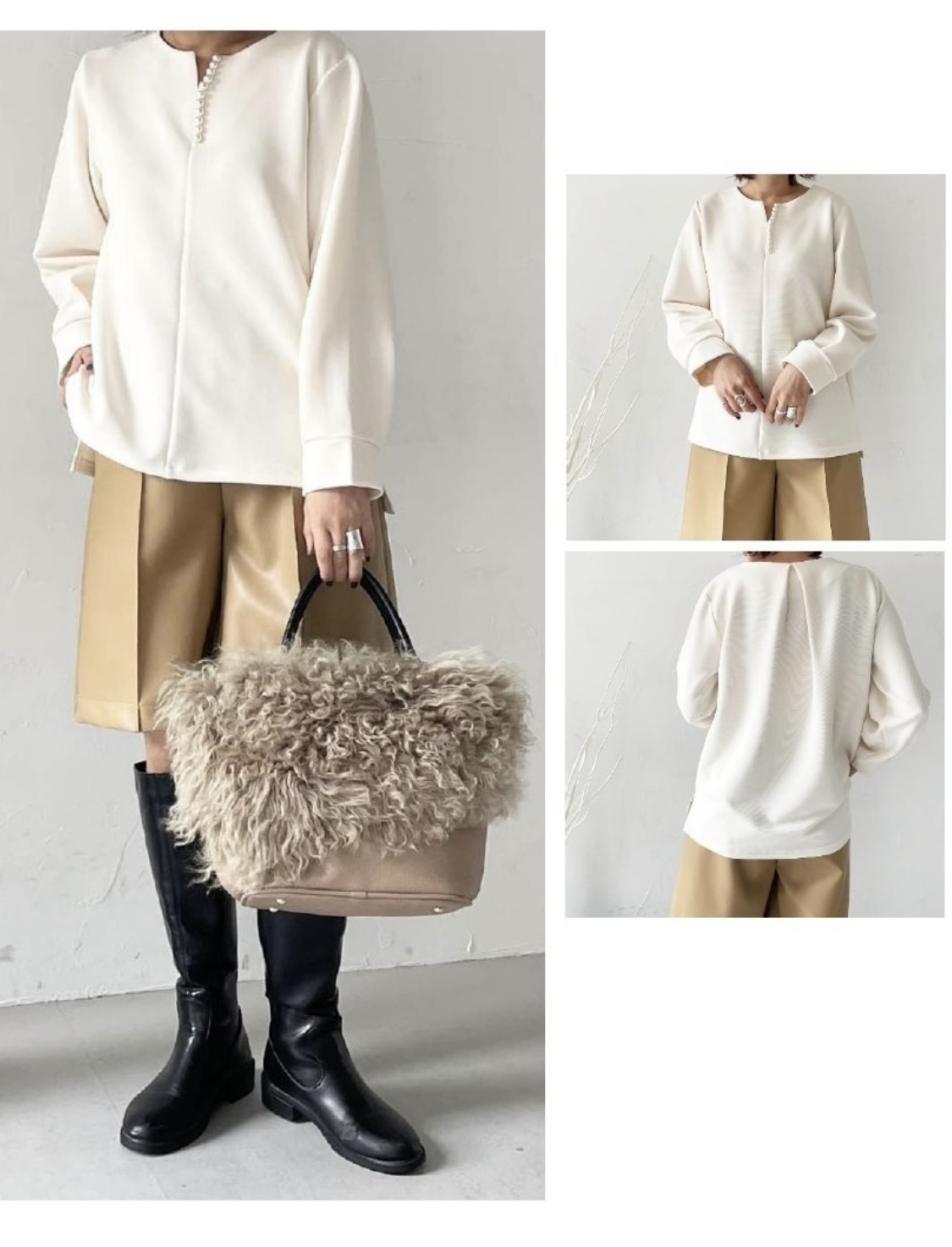 パールデザイントップス💕¥11000+tax フロントに縦に並んだパールが甘さを軽減⭐️ スッキリとした印象のデザイントップス💕 上質なポリエステル素材で、適度な伸縮あり⭐️ どんなボトムでもスタイリングがしやすい💕 品のある雰囲気でオンでもオフでも着まわしができます💕 ご自宅でイージーケアもできるので通勤にもおすすめ。 一枚あると着まわしの幅が広がるアイテムですよん😃🙌 アイボリー、ミルクベージュ、ブラックの3カラーはどれも綺麗なカラーでお薦めです 合皮素材のショートパンツは来月の入荷予定となっております💕 2022年9月23日