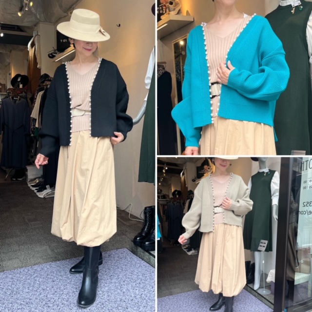 パールカーディガン💕¥14000+tax 極軽のポリエステル素材の畦編みのカーディガンは、パールを散りばめた、とってもキュートなデザインのカーディガン💕 万能に使える黒、冬に映えるターコイズブルー、フェミニンなベージュ、オフホワイトの4カラー サラッとした素材感だから春もずっとお使いいただけますよん ベージュのバルーンスカート ¥9500+tax ハット ¥7900+tax ブーツ ¥10000+tax 2022年9月24日