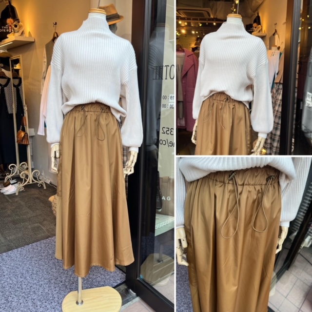 辛口ベージュのタフタ素材のロングスカートは、大人女子の秋コーデを華やかに彩ります⭐️⭐️⭐️