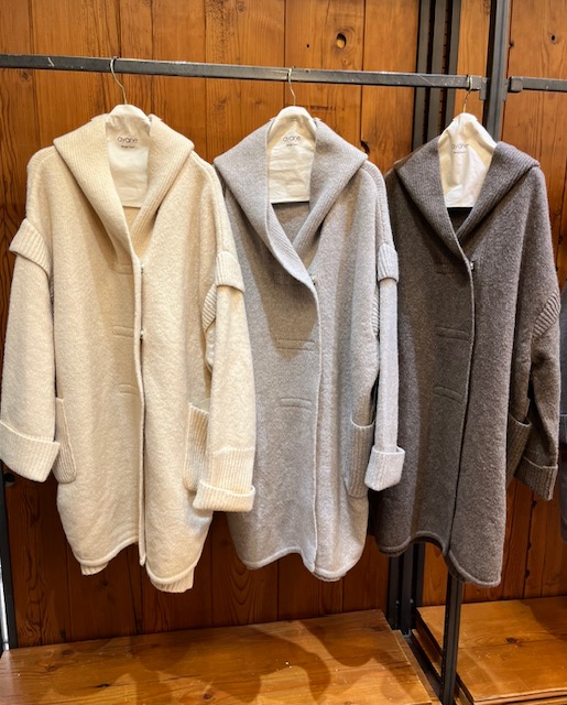 ニットガウンコート💕 軽量で暖かい💕スフレ糸のニットガウンコートが到着しました😍 スフレ糸は軽くて暖かく、ブークレっぽい質感がとてもお洒落なニット素材となっております。 どんな着こなしにもパッと羽織って、お洒落な雰囲気💕小柄さんにもおすすめの着丈です アイボリー、グレー、ブラウンの3カラー 素材 ポリエステル49% アクリル42% ウール7%ポリウレタン2% スフレ糸のガウンコート ¥24800+tax💕 2022年11月3日