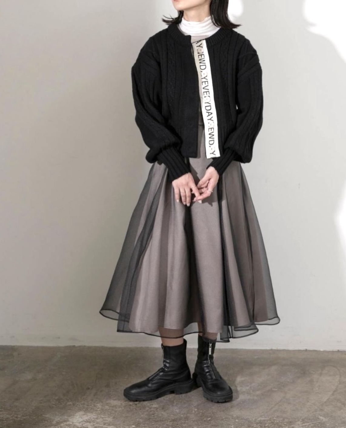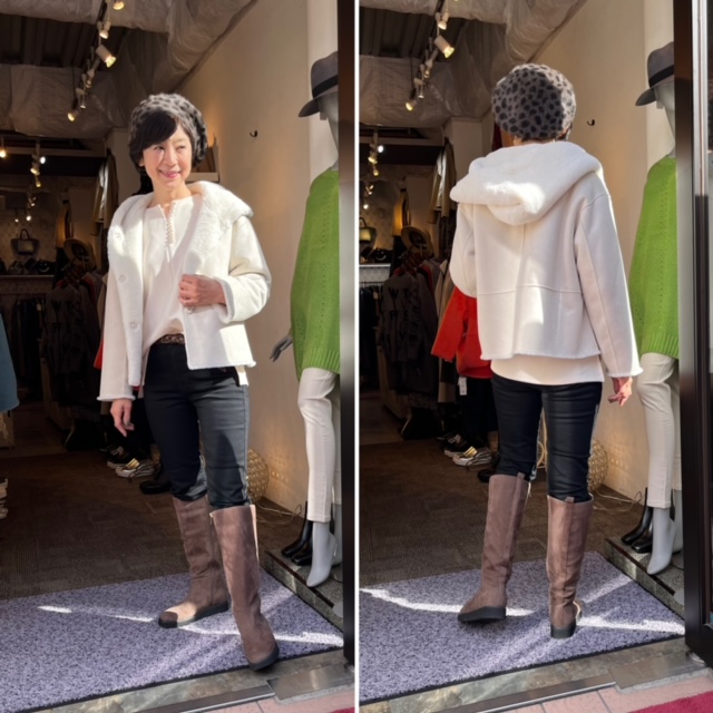 ショートコートは、ロングスカートやワンピース、ワイドパンツのスタイリングにも合わせやすく、スタイルアップ出来る⤴️アイテムです
