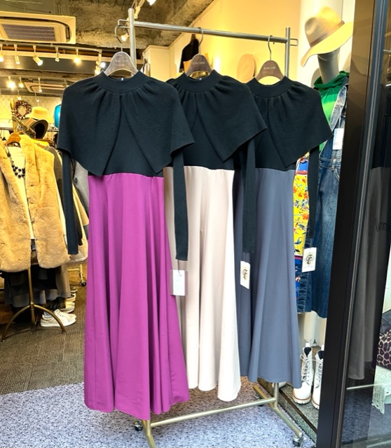 ニットケープ付きワンピース💕 トレンド感満載のニットケープ付きワンピース💕 肌触りの良いニットトップスには、おしゃれなケープがついてます💕 パープル、ベージュ、ブルーグレーの3カラー キチンと感もあり、華やかな一着です💕 サイズ38 ニット ポリエステル100% スカート ポリエステル68% レーヨン26% ポリウレタン4% ワンピース ¥16300+tax 2022年11月18日
