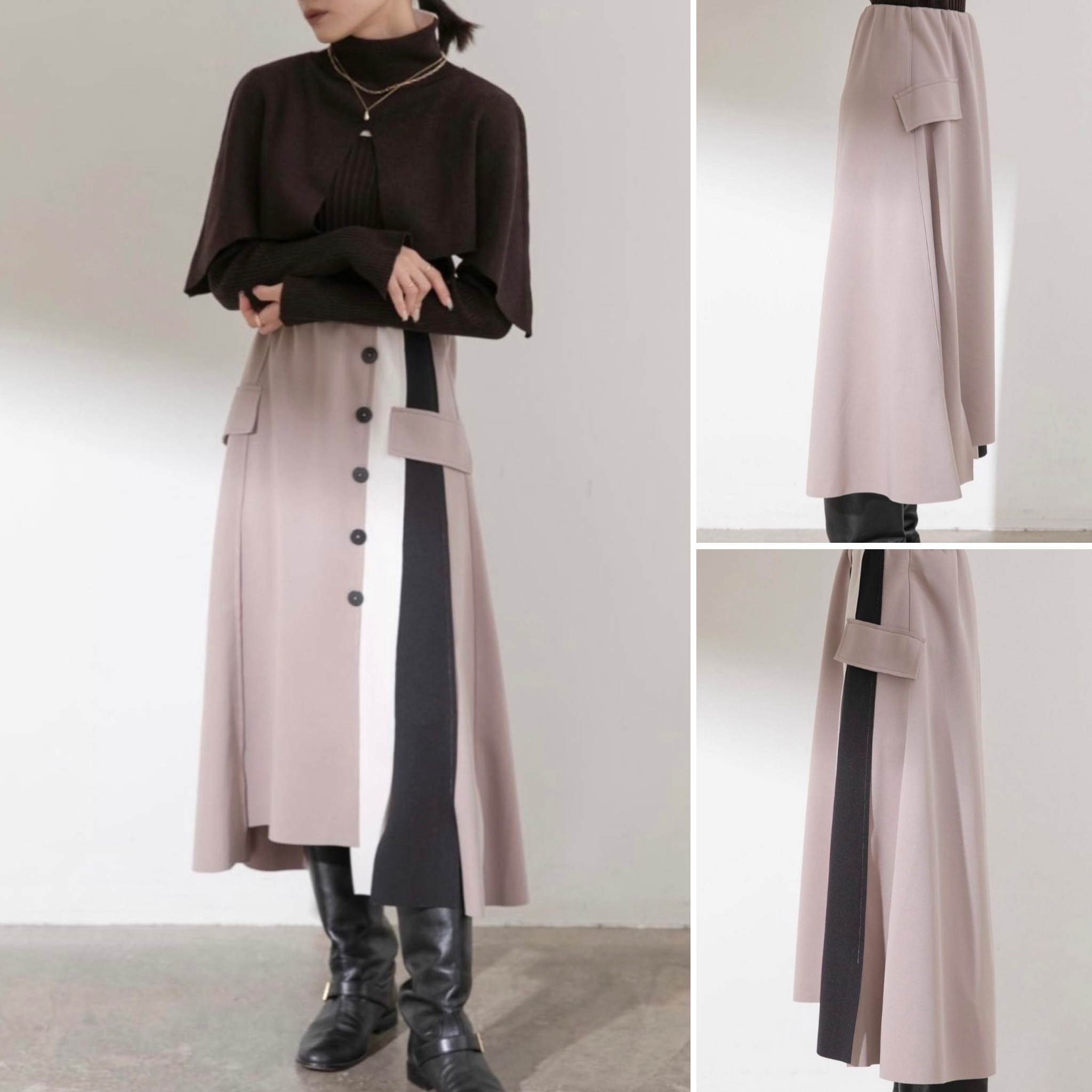 配色切り替えスカート💕 縦に見せたカラーブロックがスッキリ魅せてくれるスカート》 エイミー定評のボンディング素材でキルトスカートをイメージングしたSK💕 切りっぱなしのディテール、ボタンのアクセント、ウエストゴム、長すぎない丈感も新鮮。 ロングブーツとのスタイリング◎ 体のラインを拾わず、さらっとした肉厚の生地感、ストレッチ抜群の着心地、人気の素材です💕 サイズ ウエスト スカート丈 ヒップ 38 64/84 75/76 94 残りわずかですので、お早めにチェックお願い申し上げます スカート ¥9800+tax 2022年11月20日