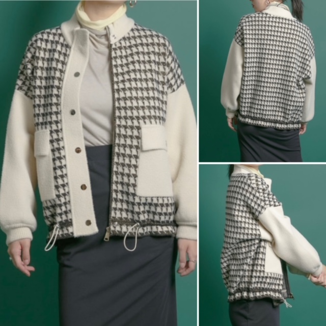ハウンドトゥース切り替えブルゾン ¥13800+tax💕 クラシックな白黒のハウンドトゥースパターンに、シャギー感のある糸にゴールドのラメ糸を引き揃え程よい光沢感を出した編み地が魅力的⭐️ ポケットディテールやドット釦、ドローコードなどブルゾンライクな雰囲気ながら、 ぽわんとした袖口のデザインがフェミニンな印象も感じさせます💕 綺麗めアイテムと合わせても、カジュアルダウンした着こなしでも、その日の気分に合わせて着用いただけます。 手軽な羽織りながらもおしゃれに見せてくれる、秋冬マストハブアイテム💕 ポリエステル50%アクリル30%毛20% 2022年11月29日