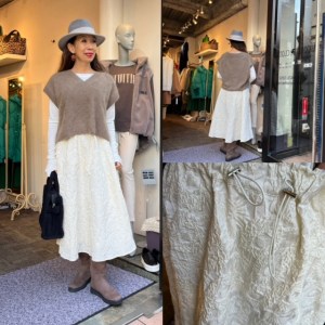 本日入荷のアイボリーのジャガードスカートに合わせて、アイボリー✖️ブラウンの優しいカラーでスタイリング💕