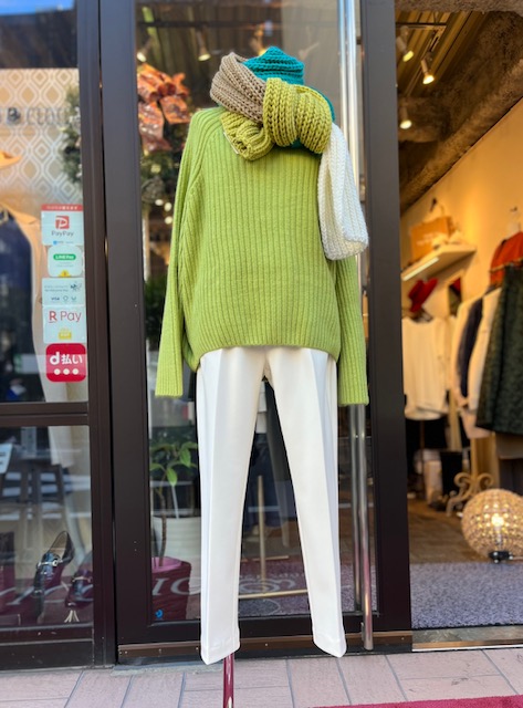 アップルグリーンのニットとストール💕 めちゃ暖かくて美脚の暖パンが30%オフ🎉🎉🎉となりました 白、黒、グリーン、グレージュなどございます これから始まる冬本番にめちゃお役立ちです 新春セール、新作も多数ございます お写真が追いつかないので、ぜひ見にいらしてくださいませー ニット ¥10000+tax パンツ ¥11000+tax 30%オフ ¥7700+tax💕 2023年1月6日