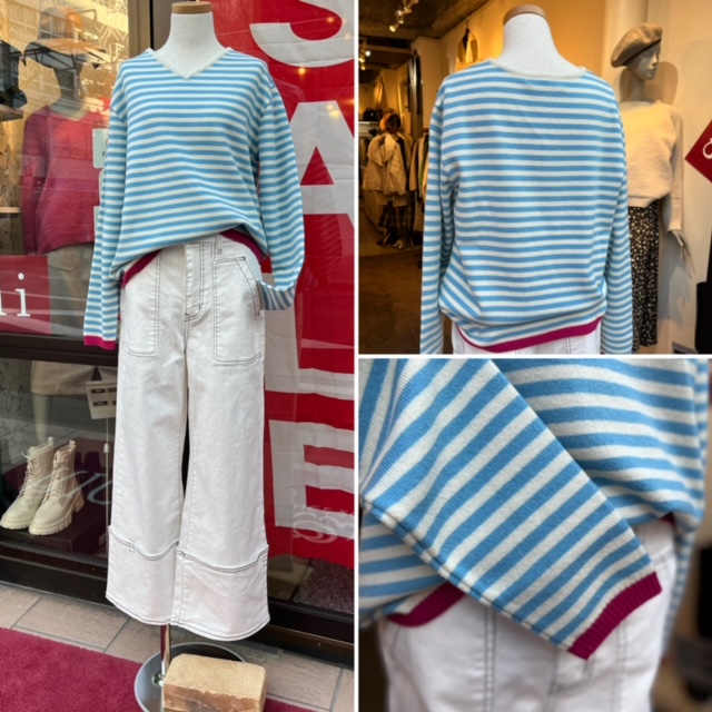 ボーダーニット💕SALE💕 made in JAPAN の上質なニットは、爽やかなサックスブルー ✖️ホワイト✖️ピンク のお洒落なカラーとスッキリしたVネックがおすすめのポイント💕 ウール 100% ¥13000+tax 20%オフ ¥10400+tax ホワイトデニム ¥14800+tax 2023年1月9日