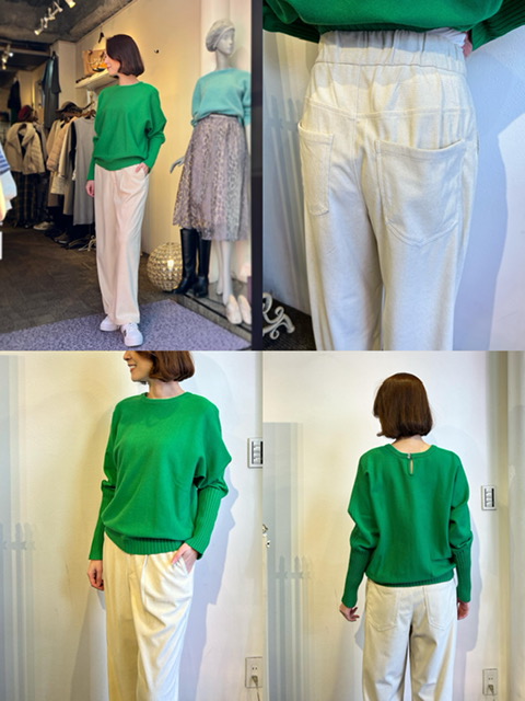 ニット¥6,072 パンツ¥8,470 袖口の長いリブデザインがポイントのニット💚 前後2wayでご着用いただけます✨ コーデュロイのパンツはバックウエストゴムで締め付け無しです🙆🏼♀️✨ すとんとしたラインでカジュアルにもキレイにも🙆🏼♀️💕 ニット¥7,590→¥6,072 パンツ¥12,100→¥8,470 2023年1月9日