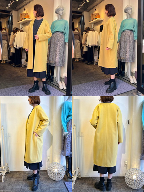 コート¥17,600→12,320 落ち着いたイエローのコート💛 ノーカラーですっきりしたデザインです。 タートルやストールを合わせて着こなしのバリエーションが楽しめます✨ ポリエステル82% レーヨン18% コート ¥17,600→12,320 コメントは受け付けていません。