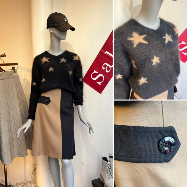 星のニット💕 ラクーン100%のラグジュアリーなニット😍を配色のスカートでコーディネートしてみました💕 ニットは極上の肌触りと極暖の着心地⭐️⭐️⭐️ 今季もラスト一枚となりました スカートはmade in JAPAN🇯🇵のハイクオリティな商品です シワにならず、しなやかな生地💕 大人女子も、冬なら黒レギンスとブーツでミニスカートも楽しんでいただけますよぉ〜 ニット ラクーン100% ¥27000+tax 30%オフ ¥18900+tax スカート ポリエステル100% 36.38.40の3サイズ ¥11000+tax 30%オフ ¥7700+tax💕💕💕 2023年1月21日