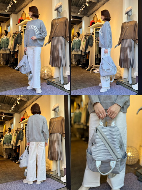 ロゴニット¥8,690 バッグ¥13,200 グレー×ホワイトコーデ🤍 もっちりとした圧縮ニットは、胸元のロゴがポイント✨ ブルゾンやコートから覗くロゴがお洒落なアクセントになります☺️ レーヨン50%、ポリエステル30%、ナイロン20%の、とても肌触りが良いニットです✨ 着丈59cm 幅63cm ロゴニット¥8,690 バッグ¥13,200 2023年1月21日