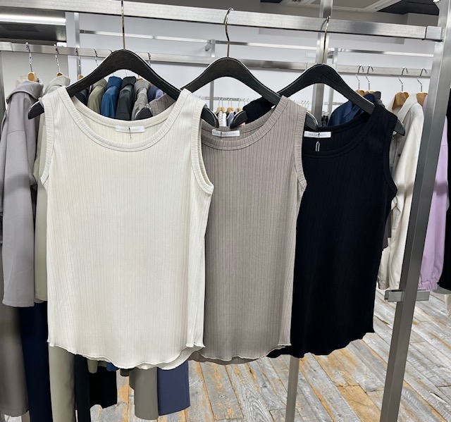 ランダムリブタンクトップ ¥2700+tax とろみ感のあるランダムリブのタンクトップがなんと2700円+tax💕💕💕 破格です😆 体のラインを拾いにくく、サラッと着られて、襟ぐりも、アーム周りも絶妙な一枚⭐️⭐️⭐️ オフ、グレージュ、モスグリーン、ブラックの4カラー ※お写真は、オフ、グレージュ、ブラックの3カラーとなっております サイズ38 ポリエステル95ポリウレタン5 着丈61 2023年2月18日
