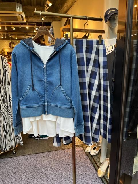 カットデニムパーカー✖️チェックスカート 伸縮素材のカットデニムパーカーはコンパクトなシルエットが優秀⭐️⭐️⭐️ フレアスカートやワイドパンツ、ワンピースなどの羽織として、すっきりスタイルアップ⤴️ お袖は長めなので、高身長の方にもお薦めです。 パーカー ¥12800+tax コットン95ポリウレタン5 スカート ¥11800+tax バックゴム仕様 M〜L ポリエステル 100 ポケット付き 2023年3月22日