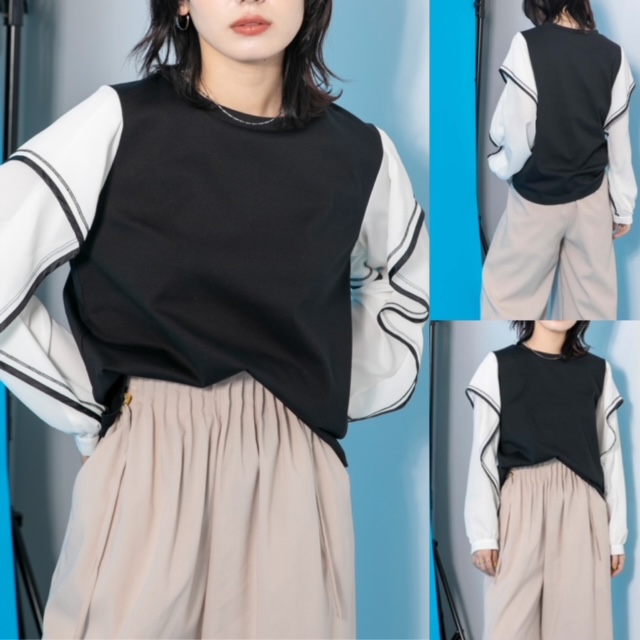 配色袖シフォントップス ¥9800+tax 上品なライトポンチにブラウス袖をドッキングしたカジュアル×きれいめなトップス💕 袖はタックフリルのデザインを施し、甘すぎない女性らしい印象に。 配色パイピングと後袖の配色が引き締め効果もありフリルデザインを引き立たせてくれる💕 ブラウスと違ってシワにもなりにくく、着心地も気持ちよいのが嬉しいポイント💕 ゆったりと着ていただくのはもちろん、ボトムインしてトップスのボリューム感を楽しむのもおすすめです。 配色は、ブラック✖️アイボリーです サイズ M 本体:綿62%ポリエステル34%ポリウレタン4%, 袖部分、パイピング部分:ポリエステル100% 2023年4月9日