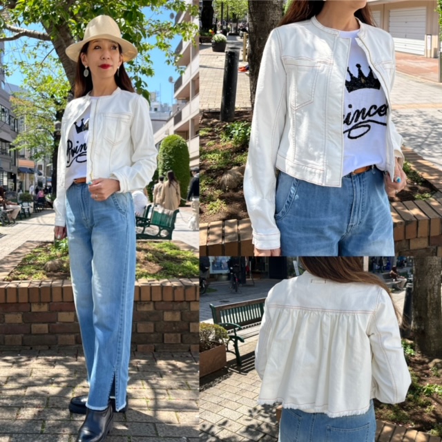 ホワイトデニムのJK💕 スッキリしたノーカラーのホワイトデニムのジャケットは、どんなアイテムにもしっかりとおさまって、ヘビロテできる💕😍 コンパクトに見えて、とても伸縮するので、ストレスフリー💕 朝晩の冷え込みにも一枚あると安心なアイテム。 お色違いは、サックスブルー 、インディゴカラーも再入荷しております。 コンパクトなシルエットなので、小柄さんにもお薦めです。 ウォッシャブル⭐️⭐️⭐️ ジャケット ¥19000+tax💕 サイズ 38 モデル 168cm ビジューTシャツ ¥6400+tax💕 コメントは受け付けていません。