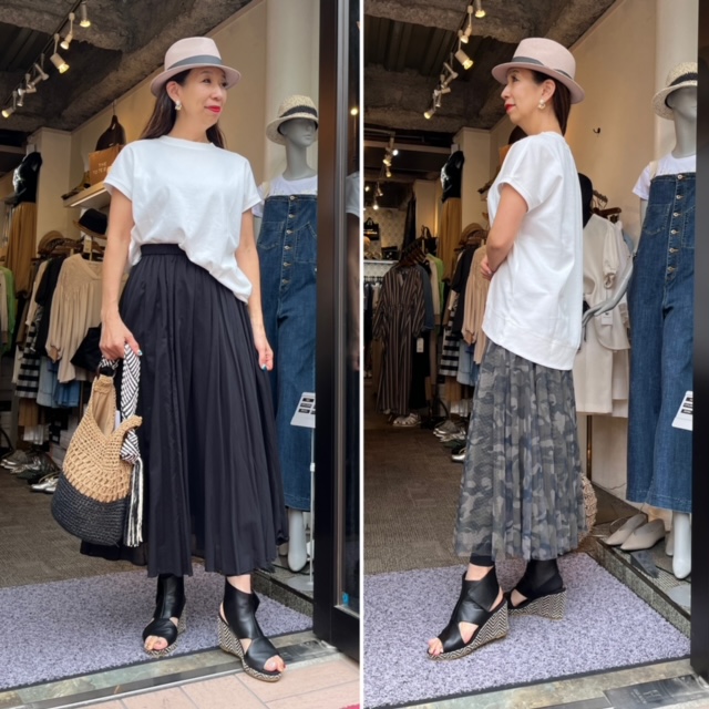大人の白T✖️スカートコーデ💕 シンプルで透けにくい、上質なコットンTはどんなアイテムにもスッキリ決まる万能アイテム。爽やかな白は毎年新しくしたいですね⭐️ ブラックのコットンボイルのスカートや迷彩のチュールスカートでクールなイメージ💕 足元は9.5センチの快適なウエッジソールサンダルで💕 黒のコットンスカート ¥12000+tax ウエストゴム フリーサイズ 迷彩のチュールスカート ¥13800+tax ウエストゴム フリーサイズ 2023年4月15日