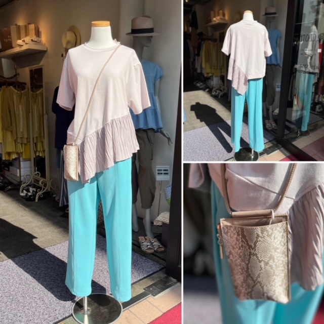 グレージュ✖️コバルトブルー💕 爽やかなコバルトブルーのパンツは、ストレッチジョーゼットの上質な素材で、伸縮あり。 フロントは、タック無し。バックはゴム仕様で立ったり座ったりもとても楽ちんです。 トップスは、斜めのフリルがかなりお洒落💕 パンツ ¥6900+tax トップス ¥8900+tax 携帯パック ¥2900+tak 2023年4月20日