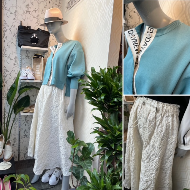 大人気のフラワージャガードのフレアスカートをロゴテープのカラーカーディガンで少しカジュアルダウンしたコーデはいかがでしょうか? 前立てのオリジナルロゴテープが程よいアクセント😍