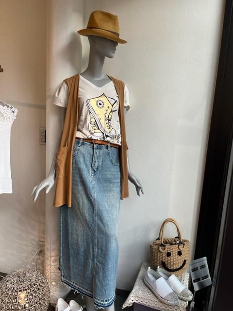 デニムスカート✖️ジレのコーデ💕 フリンジが素敵なデニムのセミタイトスカートにインポートのデザイントップスと、キャメルカラーのジレでコーディネートしてみました。 軽くてしなやかなデニムスカートは流行がなく、いつまでも新鮮なコーデが楽しめます💕 ヒップラインを気にせずお履きいただけます。 トップス ¥8000+tax ジレ ¥9900+tax スカート ¥14000+tax ベルト ¥5000+tax 2023年5月1日