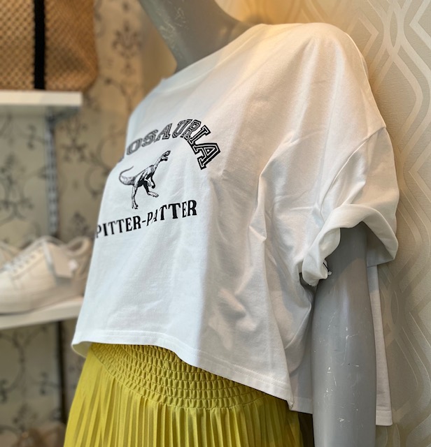 ダイナソー🦕プリントTシャツ💕 ショートの着丈で、スカートやワイドパンツ とバランスがとりやすいTシャツ💕が入荷しております。お腹にインしなくても、スッキリコーデが決まります💕 小柄な方にもお薦めの一枚。 Tシャツ ¥6900+tax⭐️⭐️⭐️ 素材 コットン 2023年5月10日
