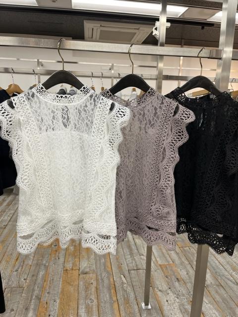 レースブラウス💕¥6900+tax💓 華やかな総レースのデザイントップスがとってもお得に入荷しました💓😍 ホワイト、グレージュ、ブラックの3カラー 素材はナイロンにコットンがミックスされているので、ノーアイロン💓でいつも綺麗。 ジャンスカやサロペットのインナーとしてもかなりお薦め。 サイズ38 素材 ナイロン90 コットン10 着丈 51 2023年5月13日