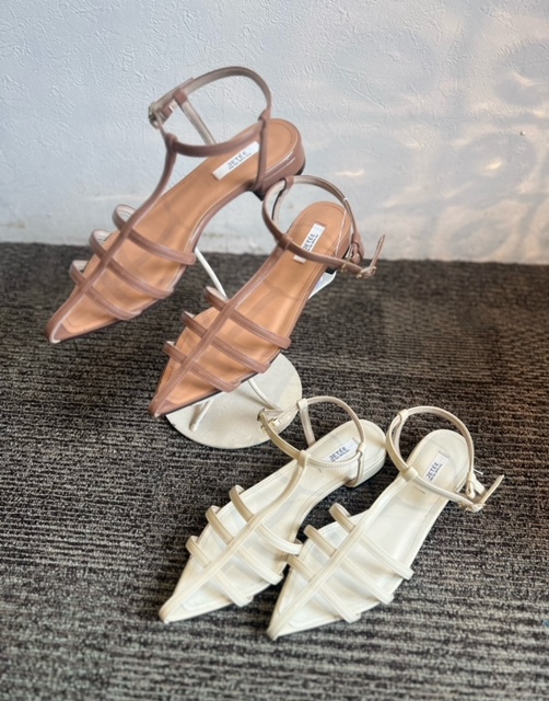 ポインテッドヌードストラップサンダル💕 華奢なストラップ使いで女性らしいバランスに仕上げたフラットシューズ✨フラットでありながらも、すっきりとしたシルエットが足を綺麗に見せてくれます✨ アンクルベルトで安定感があり歩きやすい仕様✨クセのないデザインなのでコーディネートを選ばずお使いいただけます✨ ヌーディーな肌見せで、春夏のコーディネートにマストなアイテムです✨ ヒール2cm 合成皮革 サンダル ¥12,500+tax 2023年5月25日