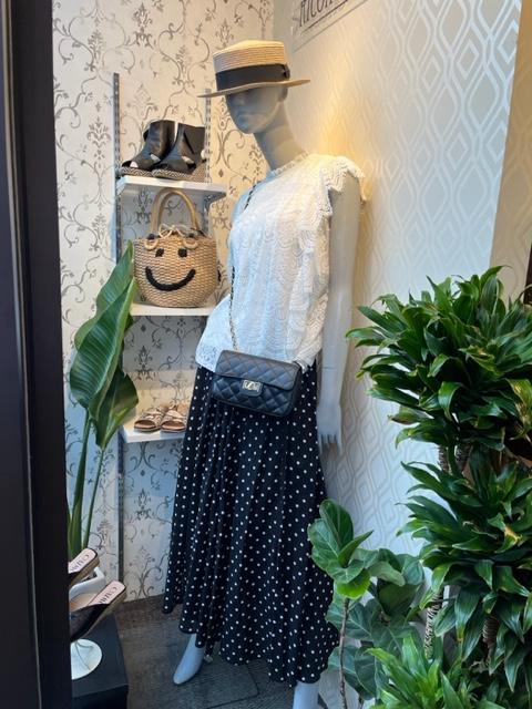 レーストップス✖️ドットスカート💕 些細なストレッチレースのトップスはどんなアイテムにも合わせやすい万能アイテム💕 カラーパンツやデニムはもちろん、レディライクなドットスカートにも素敵です💓 羽のように軽くしなやかな素材で、汗をかいてもサラサラの着心地です⭐️⭐️⭐️ 5月限定のクーポン 最大¥4000のお値引きもしております。 ぜひお買い物にお役立てくださいね。 5月31日の水曜日までお使いいただけます。 ブラウス ¥13000+tax スカート ¥13000+tax 2023年5月25日