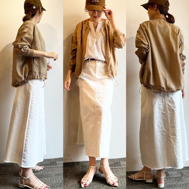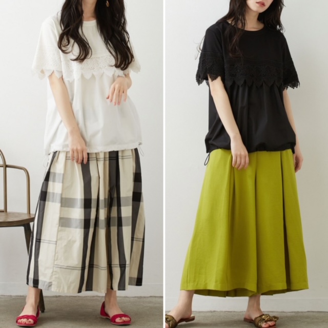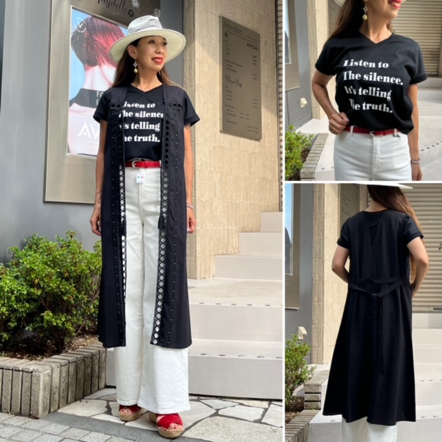 夏に履きたい白デニムのワイドパンツ には、ブラックのVネックTシャツにデザインジレを合わせたコーデはいかがでしょうか? ジレを羽織るだけで、いつものコーデを新鮮にブラッシュアップ💕