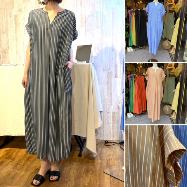 スキッパーストライプワンピース💕 ¥13000+tax💕 ポリエステル✖️コットンのサラサラ素材が気持ち良いワンピース ブラウン、サックスブルー 、ブラックの3カラーで入荷しました💕 体のラインを拾わないから、安心のデザイン💕 ポケットあり 着丈 125 モデル身長 166 2023年6月4日