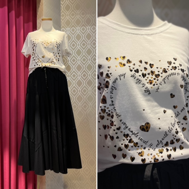 ハート❤️Tシャツ ¥6900+tax 今週イタリア🇮🇹から到着した、メタリックなハートがキュートなTシャツ💕 セミフレアの切り替えスカートで、大人モノトーンなコーデに💕 スカートはウェストゴム&リボン仕様でSサイズの方にもジャストサイズに調整可能です Tシャツ ¥6900+tax💕 Mサイズ スカート ¥11000+tax 素材 コットン100 サイズ M 2023年6月7日