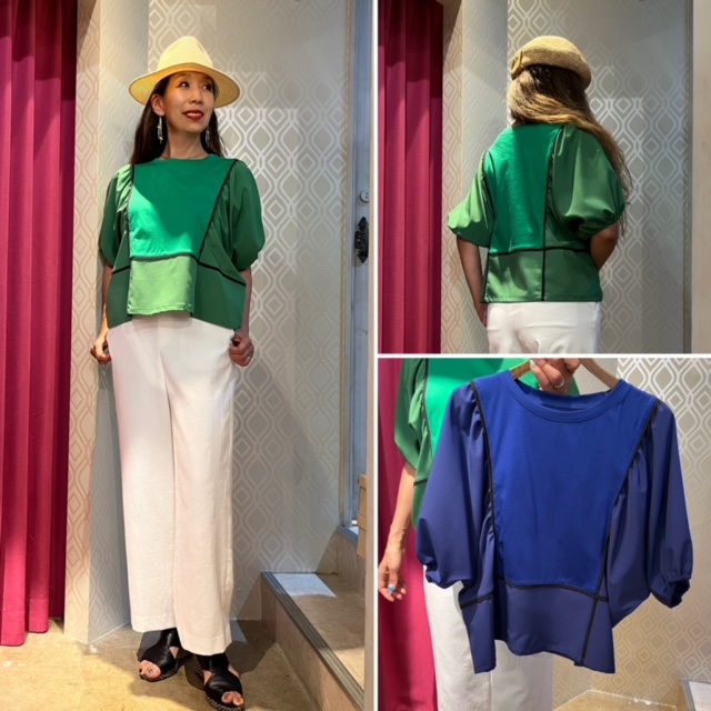 配色トップス💕¥7900+tax カットソーの本体にポリエステルシフォン素材のお袖を付けたドッキングのトップスです💕 驚くほど軽くしなやかで着心地良し💕 透け感無しで、一枚着用可能です⭐️⭐️⭐️ グリーン、ブルーの2カラーで再入荷しました。 (カットソー部分) ・綿 100% (布帛部分) ・ポリエステル 95% ・ポリウレタン 5% L-49:B-116 2023年6月7日