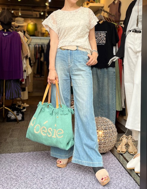 🇮🇹レーストップス💕¥11000+tax イタリアからインポートの総レースのトップス💕 アイボリーにシャンパンゴールドの総レースでオールシーズン活躍してくれそう。 冬はアイボリーのインナーに合わせて💕 デニムのワイドパンツ は、通常のデニムよりも軽量になっており、薄手の素材で真夏もサラッと着られます。 おサイズもXSの23インチからLサイズの27インチまで展開しております。 トップス ¥11000+tax 手洗い可💕 サイズ M デニム ¥14800+tax バック フランス🇫🇷 ¥9000+tax 2023年6月21日