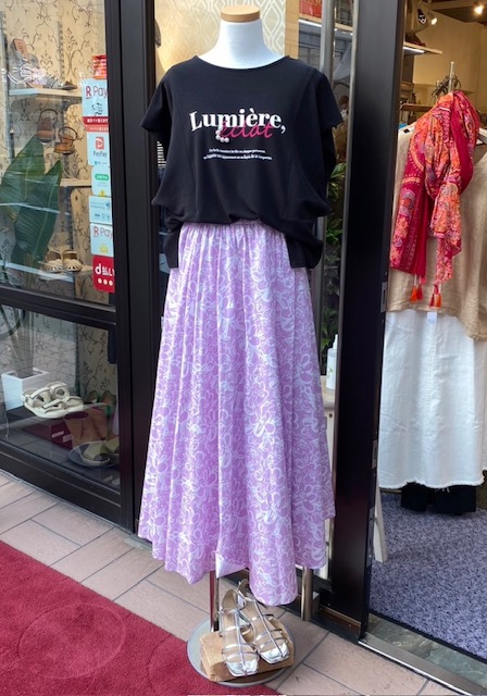 ピンク✖️ブラックコーデ💕 ちょっと甘めのピンクのフレアスカートには、引き締めカラーのブラックのトップスで、甘さを軽減💕 ブラックにローズピンクのロゴとパールが絶妙なアクセント💕 わき見え防止の、アーム周りも嬉しい💕 トップス ¥6900+tax コットン95 ポリエステル5 スカート ¥13000+tax コットン100 素材 表地コットン100 裏地 コットン100 サンダル ¥9000+tax 2023年6月24日