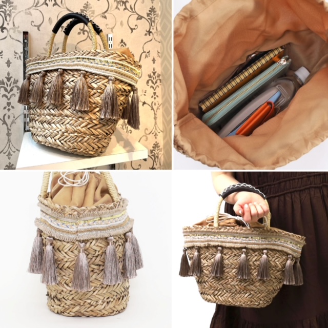 シーグラスに細かな刺繍が施されたテープを合わせたエスニックテイストのカゴバッグ。